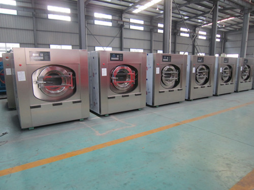 大型工業洗衣機廠生產的水洗機脫水筒的高速運轉產生離心力使含在織物中水分被甩出,便于織物晾曬,加速織物干燥。